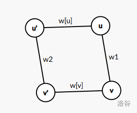 从 \(v\) 到 \(u\) 有两种情况,直接走 \((u,v)\) 间的连边 \(w_1\),或者换树走,\(v\rightarrow v'\rightarrow u'\rightarrow u\),权值 \(w[v]+w[u]+w_2\)。其它情况同理。