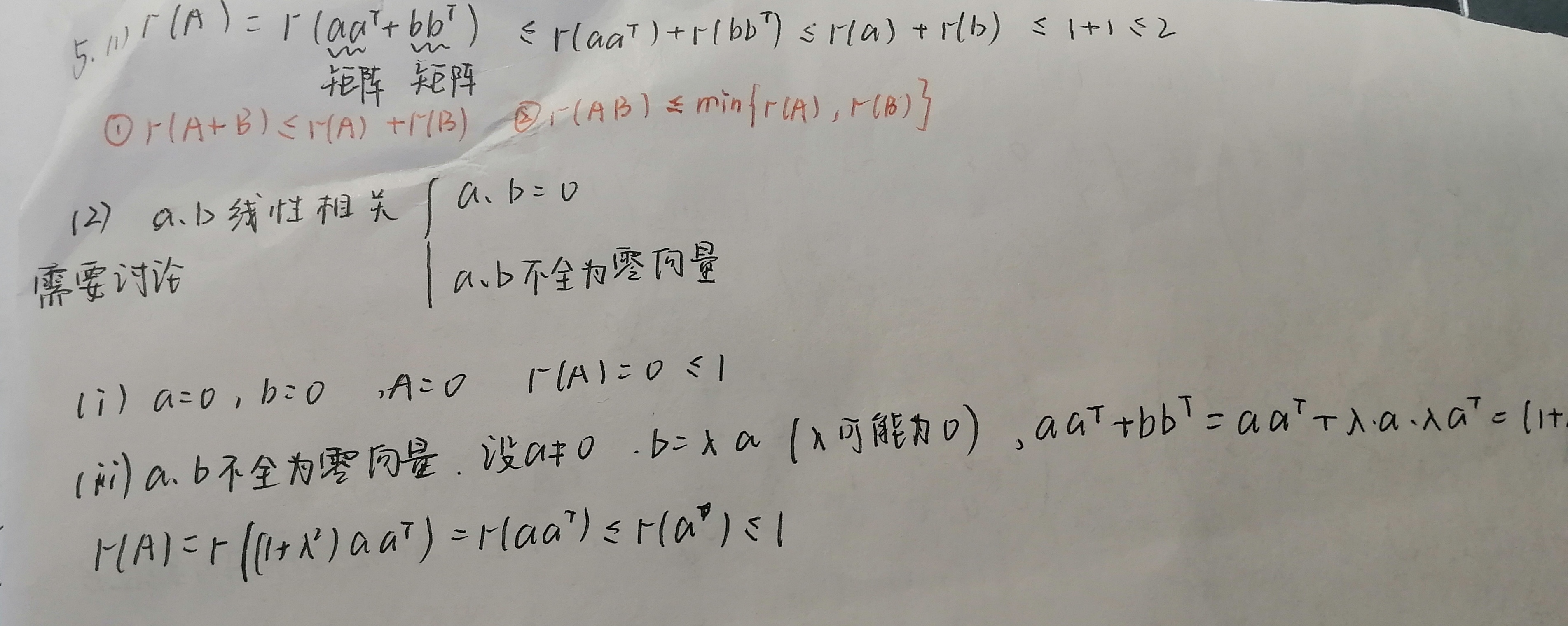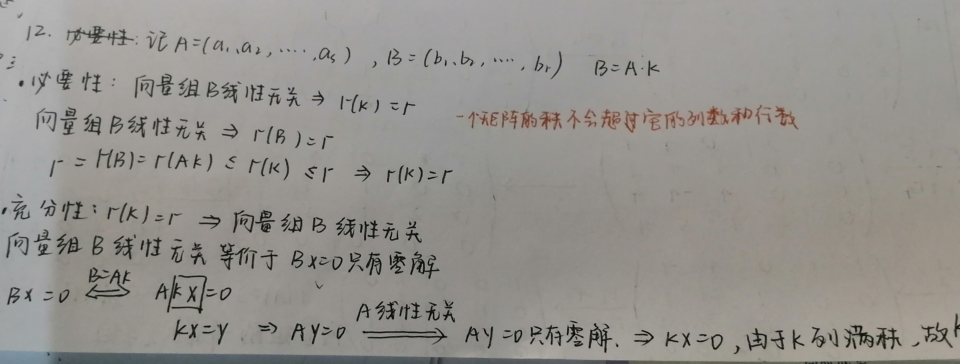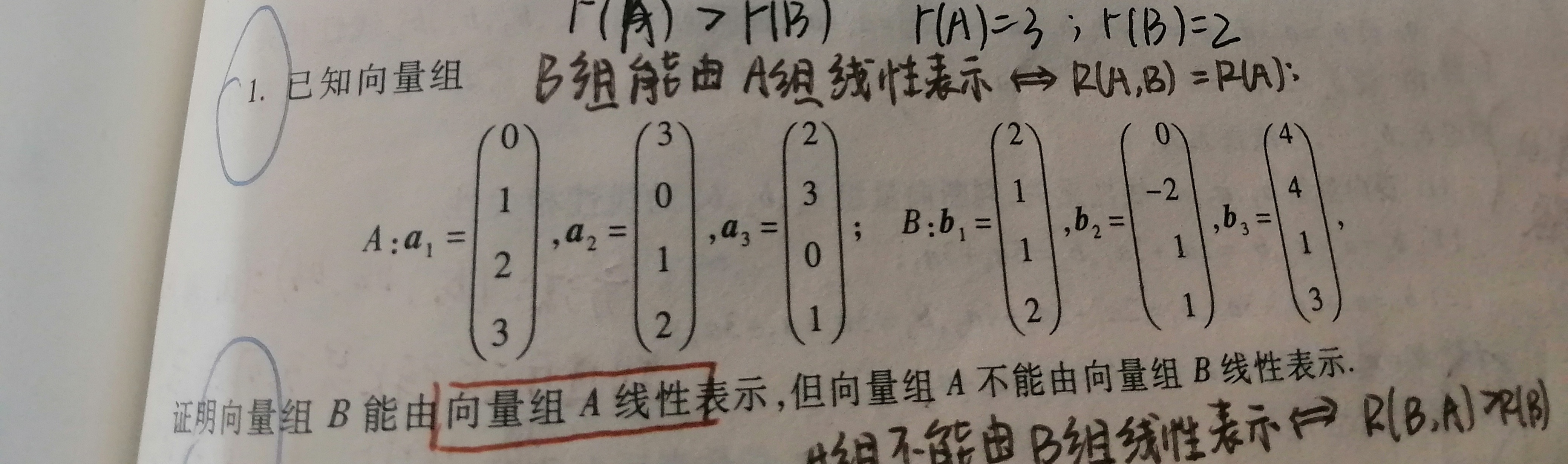 1.向量组A能线性表示向量组B --->只需要证明A的秩等于增广矩阵A,B的秩