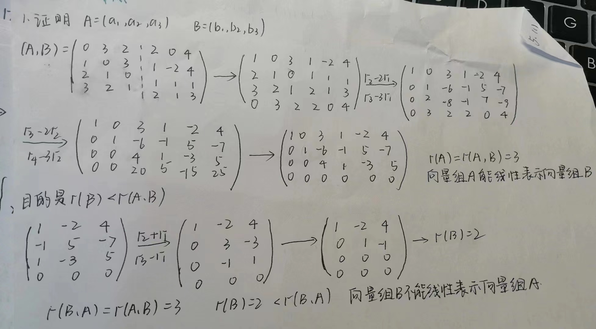 技巧:先算增广矩阵A,B的秩,再单独取出B,增广矩阵A,B的秩等于B,A的秩