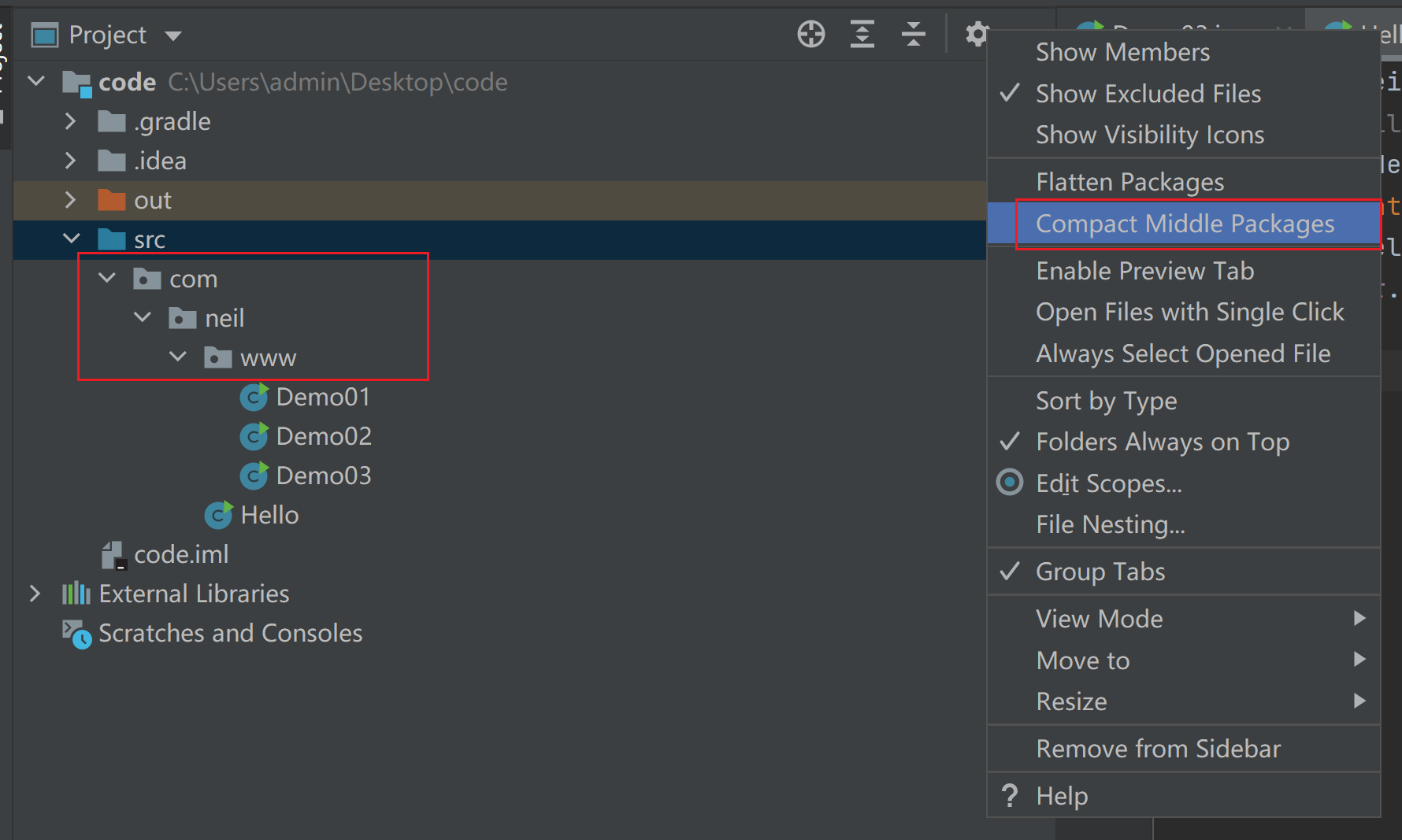 如下设置把Compact Middle Package 勾选去掉,就可以分类显示