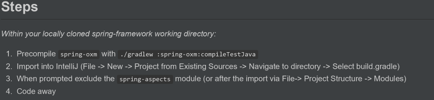 在 spring-framework 中有一个 import-into-idea.md 文件,里面指出了编译源码的步骤,内容截图如下: