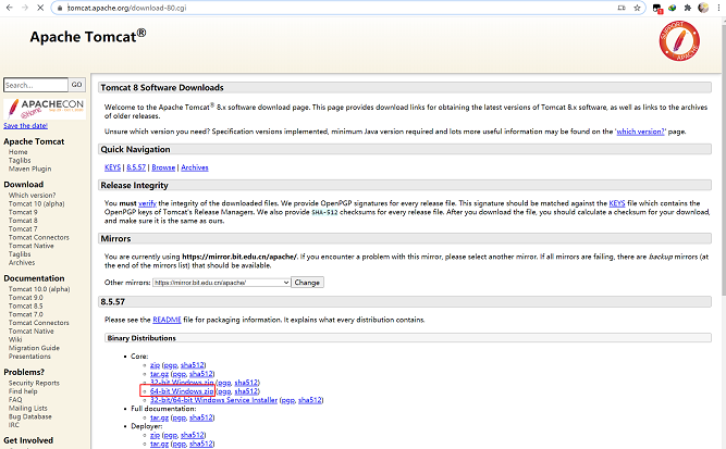 2.下载tomcat 地址“https://tomcat.apache.org/download-80.cgi”