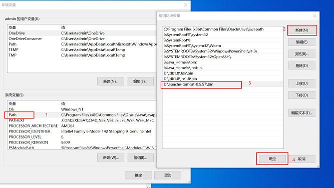 选中Path变量,双击Path变量。弹出框中选择【新建】,在光标闪烁的空白处填写:D:\apache-tomcat-8.5.5\bin
