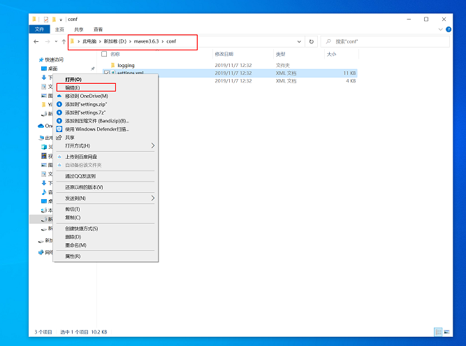D:\maven3.6.3\conf,找到settings.xml文件,右键选中[编辑]