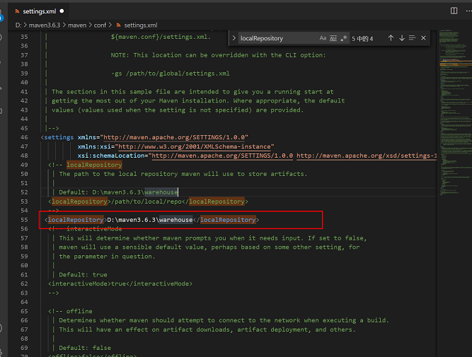 打开settings.xml,更改本地资源库到D盘的 D:\maven3.6.3\warehouse(需要在D盘maven3.6.3目录下新建一个叫warehouse的文件夹)