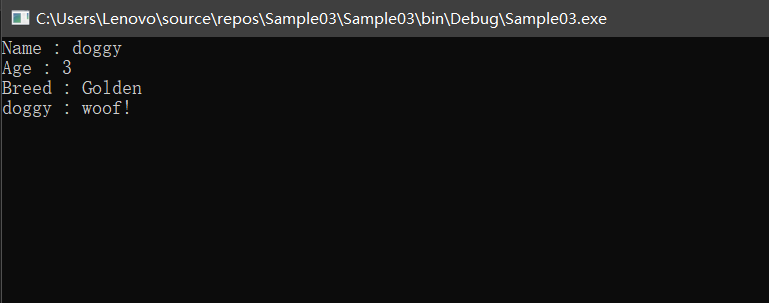 Console.WriteLine("Breed : " + breed);