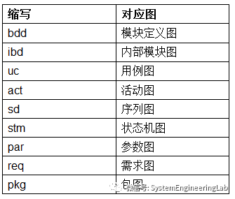 图类型的命名只能在SysML定义的图类型缩写集合中选择,用户不能随意命名。SysML中定义的图类型的缩写集合简称如下所示: