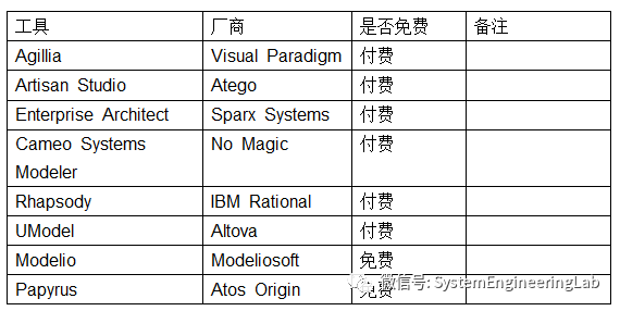 我们说,SysML是一种图形化的建模语言,OMG组织发布了针对SysML的建模语言描述规范,其详细定义的SysML的语义。面面俱到的规范并不适合SysML初学者,这些主要面向建模规范制定者以及相关的建模工具厂商,用于进行建模规范制定以及建模工具的开发实现。支持SysML这一图形化的建模语言的商业或免费的工具如下表,仅供参考。当然,用户也可以基于SysML规范实现一款全新的建模工具。
