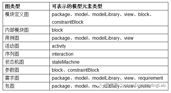 SysML定义了模型元素类型集合,这些类型的模型元素在图中是不能任意出现的,每种SysML图中所能表达的模型元素是有规则限制的,参考如下的模型图和模型元素匹配表。关于元素类型所表达的含义在后续系列文章中详细说明。