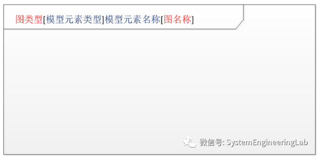 SysML的通用图形表述如下图所示,每个SysML图都有图外框、头部以及内容区域三部分组成。图外框是指图的外部黑色实线,在SysML中外框不能省略。内容区域是存放SysML模型元素的地方。头部位于图的左上角,对模型图的类型、名称、模型元素类型及名称进行概要性描述。