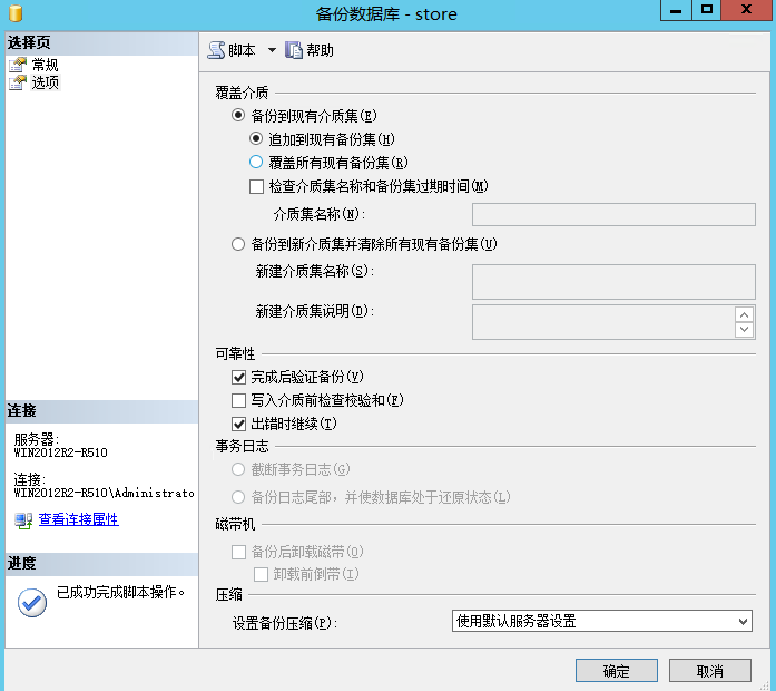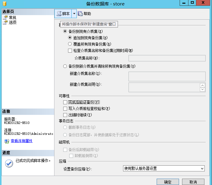 1 BACKUP DATABASE [store] TO DISK = N'E:\mssql\store.bak' WITH NOFORMAT, NOINIT, NAME = N'store-完整 数据库 备份', SKIP, NOREWIND, NOUNLOAD, STATS = 10 2 GO 3 declare @backupSetId as int 4 select @backupSetId = position from msdb..backupset where database_name=N'store' and backup_set_id=(select max(backup_set_id) from msdb..backupset where database_name=N'store' ) 5 if @backupSetId is null begin raiserror(N'验证失败。找不到数据库“store”的备份信息。', 16, 1) end 6 RESTORE VERIFYONLY FROM DISK = N'E:\mssql\store.bak' WITH FILE = @backupSetId, NOUNLOAD, NOREWIND 7 GO