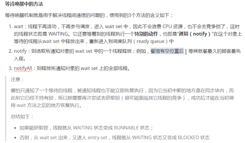 1 public class Noodle { 2 String noodle; 3 String seasoning; 4 boolean flag = false; 5 } 6 7 8 public class Cook extends Thread { 9 10 private Noodle noodle; 11 12 public Cook(Noodle noodle) { 13 this.noodle = noodle; 14 } 15 16 @Override 17 public void run() { 18 int count = 0; 19 while (true) { 20 synchronized (noodle) { 21 if (noodle.flag == true) { 22 try { 23 noodle.wait(); 24 } catch (InterruptedException e) { 25 e.printStackTrace(); 26 } 27 } 28 29 System.out.println("Cooker start cook noodles !"); 30 if (count % 2 == 0) { 31 noodle.noodle = "粗面"; 32 noodle.seasoning = "牛肉"; 33 } else { 34 noodle.noodle = "细面"; 35 noodle.seasoning = "脆臊"; 36 } 37 count ++; 38 System.out.println(noodle.seasoning + noodle.noodle); 39 40 try { 41 Thread.sleep(3000); 42 } catch (InterruptedException e) { 43 e.printStackTrace(); 44 } 45 noodle.flag = true; 46 noodle.notify(); 47 System.out.println("ready eat noodles !" + noodle.seasoning + noodle.noodle); 48 } 49 50 51 } 52 } 53 } 54 55 56 57 public class Customer extends Thread { 58 59 private Noodle noodle; 60 61 public Customer(Noodle noodle) { 62 this.noodle = noodle; 63 } 64 65 @Override 66 public void run() { 67 while (true) { 68 synchronized (noodle) { 69 if (noodle.flag == false) { 70 try { 71 noodle.wait(); 72 } catch (InterruptedException e) { 73 e.printStackTrace(); 74 } 75 } 76 System.out.println("start eat nooodles !"); 77 System.out.println(noodle.seasoning + noodle.noodle); 78 noodle.flag = false; 79 noodle.notify(); 80 System.out.println("noodles none ..."); 81 } 82 } 83 } 84 } 85 86 87 88 public class TheadTest { 89 90 public static void main(String[] args) { 91 Noodle noodle = new Noodle(); 92 new Cook(noodle).start(); 93 new Customer(noodle).start(); 94 } 95 96 }