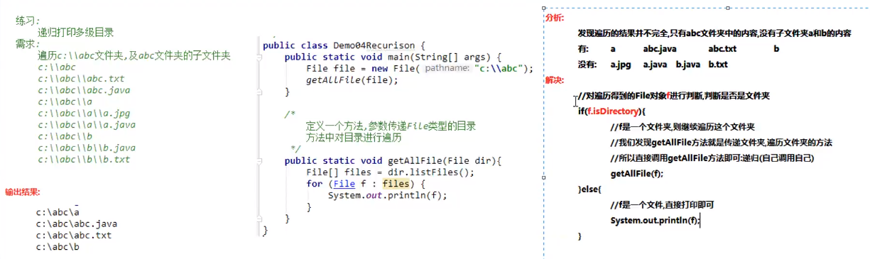 1 public class FileDemo { 2 public static void main(String[] args) { 3 File f = new File("E:\\1"); 4 getAllFiles(f); 5 6 } 7 8 private static void getAllFiles(File dir) { 9 File[] files = dir.listFiles(); 10 for (File file : files) { 11 if (file.isDirectory()) { 12 getAllFiles(file); 13 } else { 14 System.out.println(file); 15 } 16 } 17 } 18 } 19 20 21 22 public class FileDemo1 { 23 public static void main(String[] args) { 24 File f = new File("E:\\centos"); 25 getAllFiles(f); 26 } 27 28 private static void getAllFiles(File dir) { 29 File[] files = dir.listFiles(); 30 for (File file : files) { 31 if (file.isDirectory()) { 32 getAllFiles(file); 33 } else { 34 if (file.toString().endsWith(".zip")){ 35 System.out.println(file); 36 } 37 } 38 } 39 } 40 }