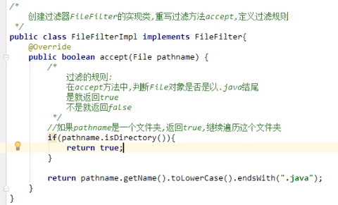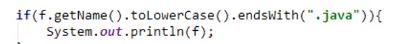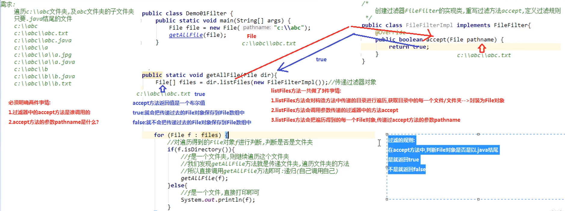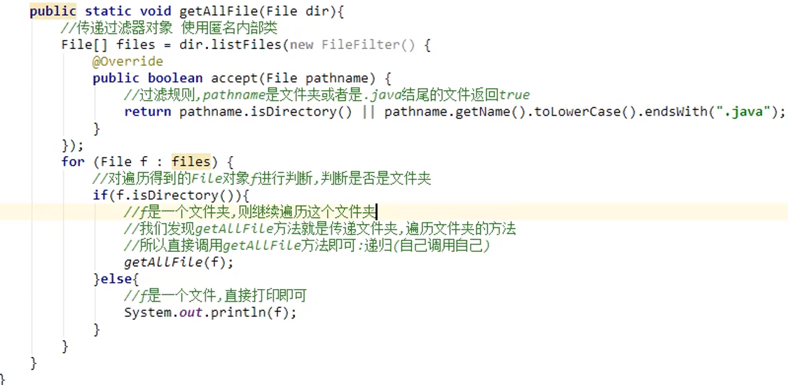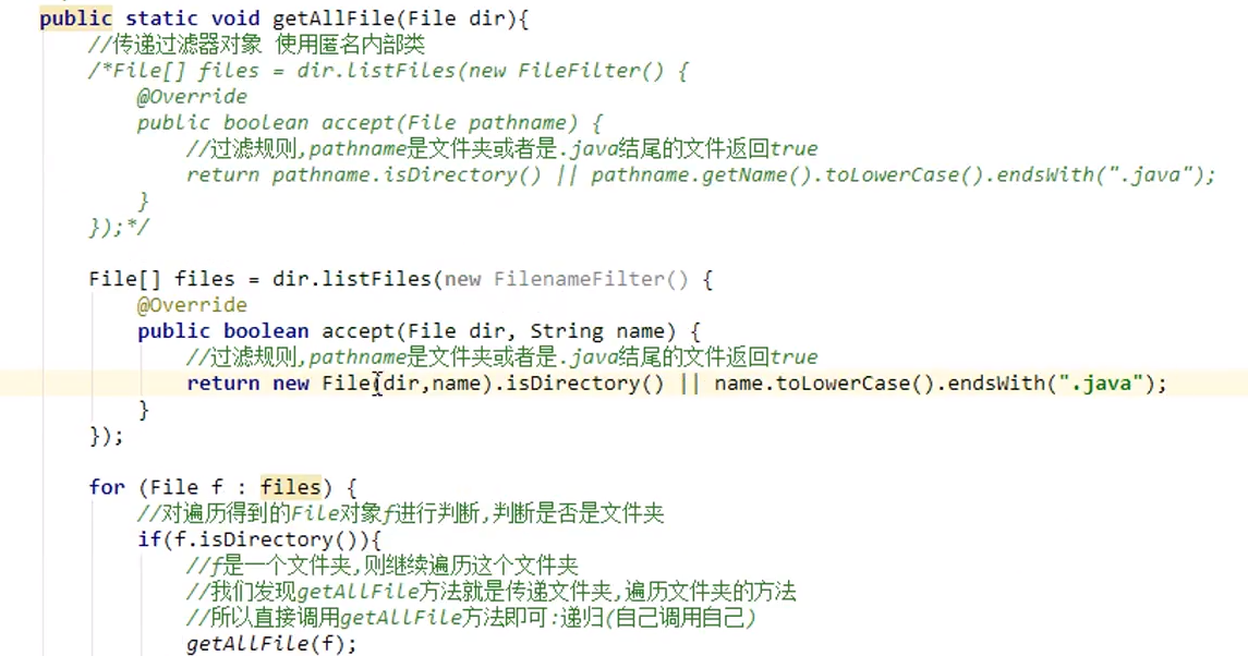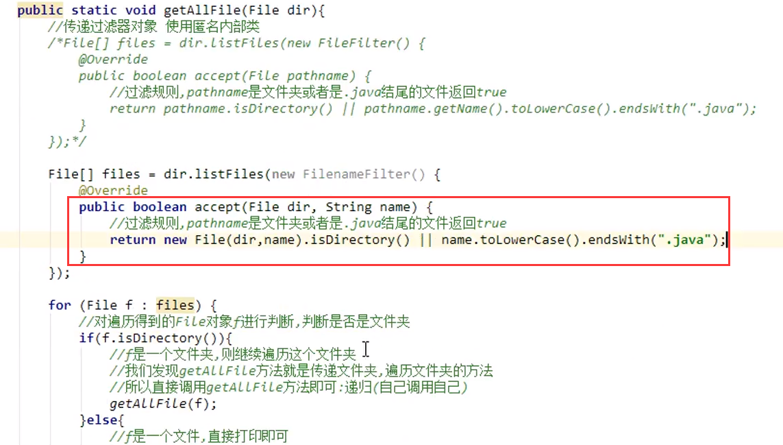 1 public class FileDemo2 { 2 public static void main(String[] args) { 3 File f = new File("E:\\centos"); 4 getAllFiles(f); 5 } 6 7 private static void getAllFiles(File dir) { 8 // File[] files = dir.listFiles(new FileFilter() { 9 // @Override 10 // public boolean accept(File pathname) { 11 // return pathname.isDirectory() || pathname.getName().toLowerCase().endsWith(".zip"); 12 // } 13 // }); 14 15 File[] files = dir.listFiles(pathname -> pathname.isDirectory() || pathname.getName().toLowerCase().endsWith(".zip")); 16 17 // File[] files = dir.listFiles(new FilenameFilter() { 18 // @Override 19 // public boolean accept(File dir, String name) { 20 // return new File(dir, name).isDirectory() || name.toLowerCase().endsWith(".zip"); 21 // } 22 // }); 23 24 // File[] files = dir.listFiles((File d, String name) -> { 25 // return new File(d, name).isDirectory() || name.toLowerCase().endsWith(".zip"); 26 // }); 27 // File[] files = dir.listFiles((d, name) -> new File(d, name).isDirectory() || name.toLowerCase().endsWith(".zip")); 28 29 for (File file : files) { 30 if (file.isDirectory()) { 31 getAllFiles(file); 32 } else { 33 System.out.println(file); 34 } 35 } 36 } 37 }