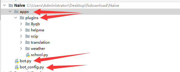 项目里新建 bot.py bot_config.py apps目录,并在apps目录下再新建plugins目录,这是官方建议