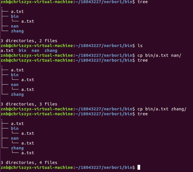 (7)把当前目录的第一个子目录中文件a.txt复制到第二个子目录中,然后再次把第一个子目录中的a.txt复制到第三个子目录并命名为b.txt,最后把第一个子目录中文件a.txt重命名为c.txt。通过tree命令查看当前目录情况。