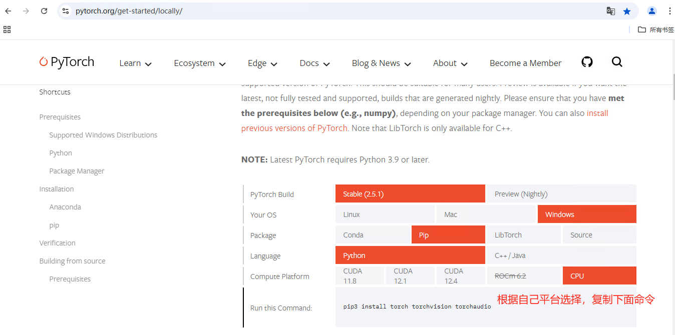 Detectron2 基于 PyTorch 框架,因此需要先安装 PyTorch。首先登陆PyTorch的官网 https://pytorch.org/