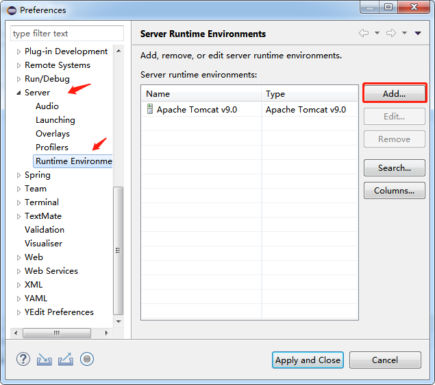 1、windows -> Preferences ->Server ->Runtime Environments -> Add 选择Tomcat安装目录