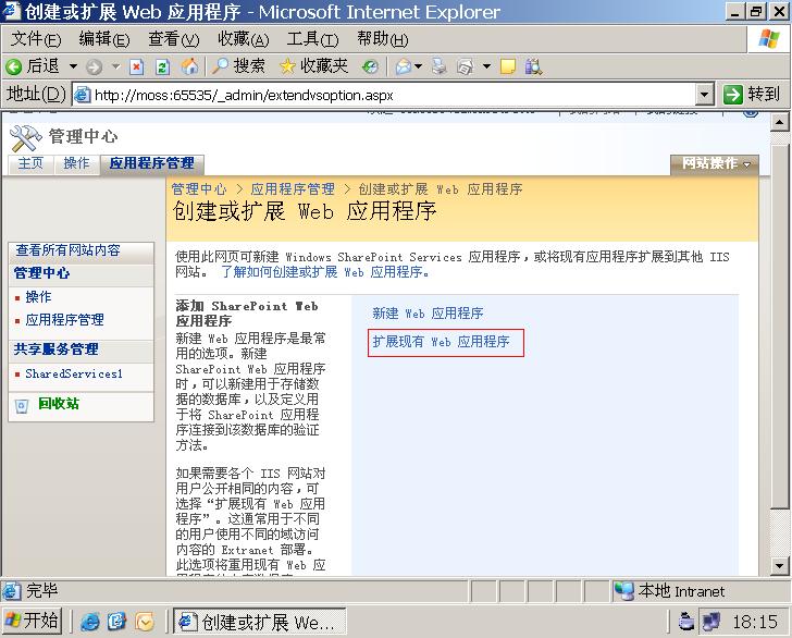 2.在“创建或扩展Web应用程序”管理界面,点击“扩展现有Web应用程序”。