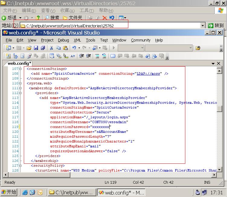 1. 首先,我们要打开管理中心的站点主目录,修改其web.config文件。按照上一篇中的做法,把<connectionStrings>和<membership>节做与镜像站点同样的修改。