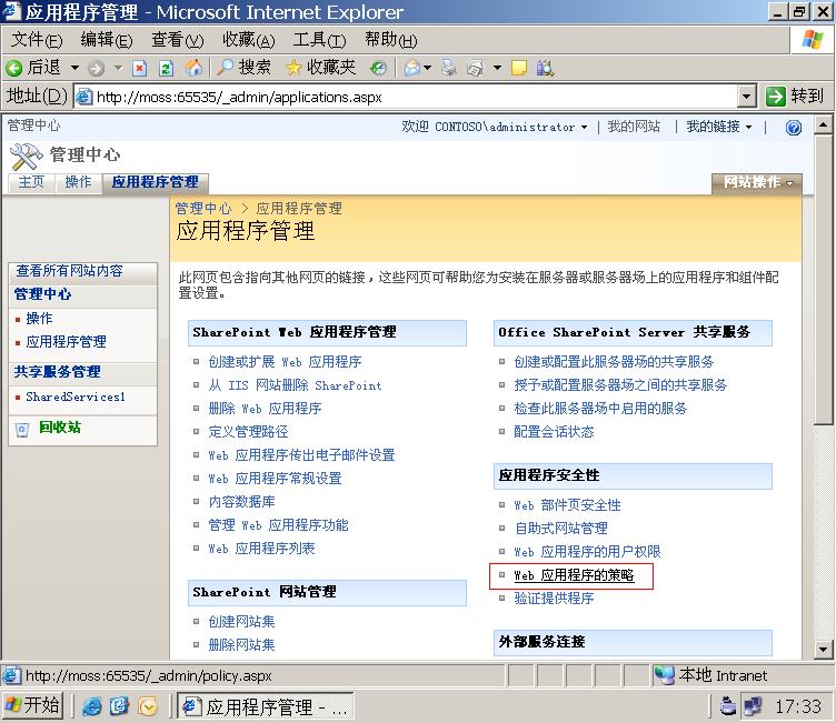 2. 然后进入管理中心界面,在“应用程序管理”界面中点击“Web应用程序的策略”。