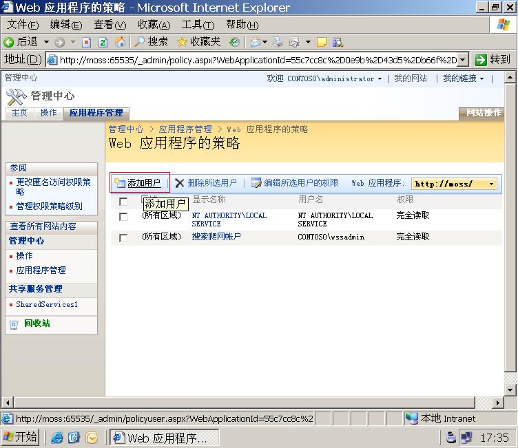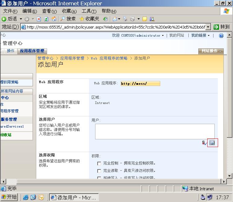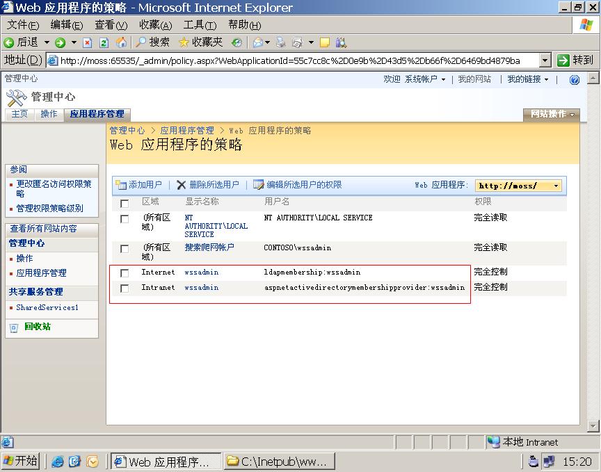 8. 此时,在“Web的应用程序策略”界面中,我们就可以看到,我们为Intranet区域添加了一个完全控制的管理账户。同时,通过账户的名称前缀,可以看出该账户是由我们的Provider提供的。