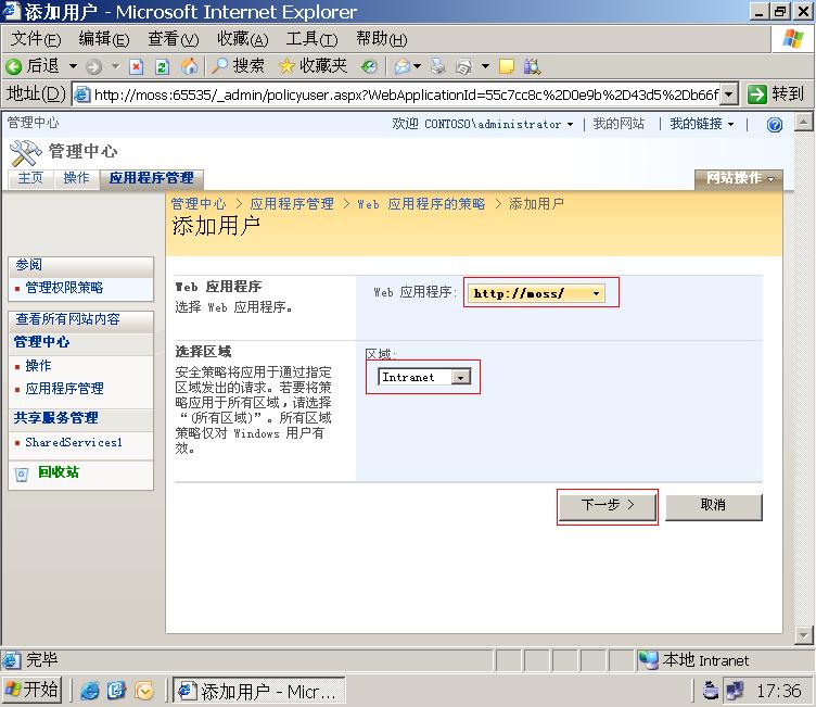 4. 在“添加用户”界面中,选择我们的站点和区域,并单点“下一步”按钮。