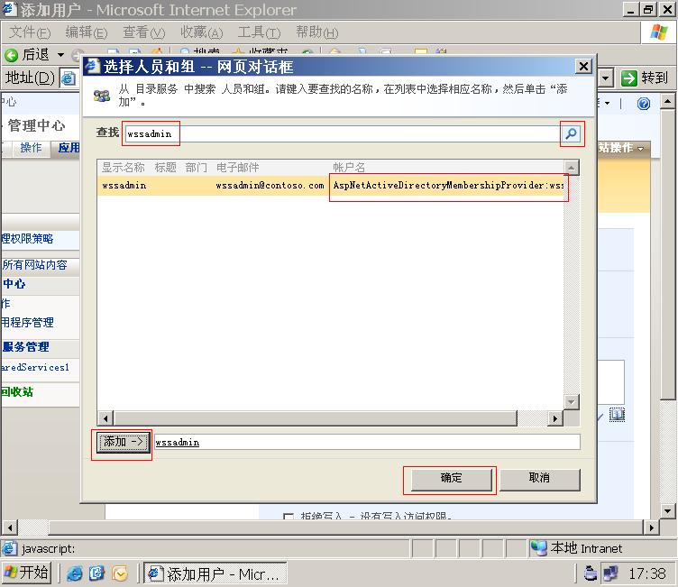 6. 此时会弹出浏览用户的对话框,在查找文本框中输入你的管理账号名称,如“wssadmin”,然后点击“查找”按钮(一个放大镜图标),然后下面的列表中会列出账号的相关信息,可以发现“账户名”有“AspNetActiveDirectoryMembershipProvider”前缀。单点“添加”按钮,最后点击“确定”按钮。