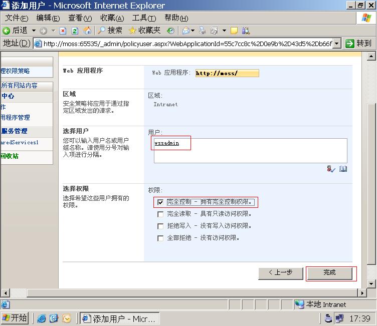 7. 对话框关闭后,会发现“选择用户”的文本框中已经有了我们所选择的账户,我们再在下面的“选择权限”一节中勾选“完全控制”选项,并单击“完成”按钮。