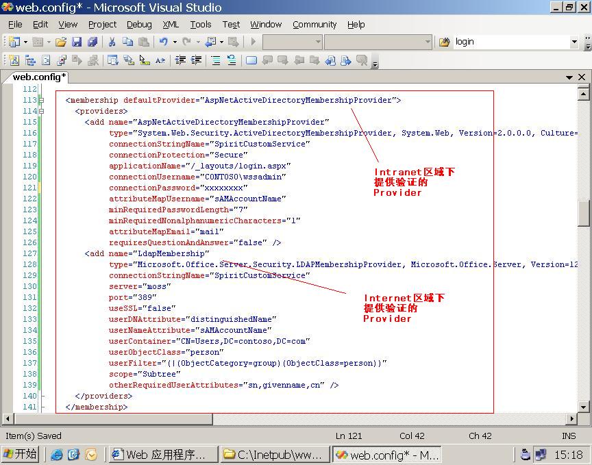 当然,如果你不想用AD做为用户管理,你也可以配置“AspNetSqlMembershipProvider”利用数据库进行用户管理,有关它的配置网上已经有很多介绍了,这里就不介绍了。当然,你也可以自己写一个Provider。