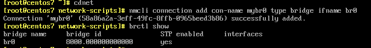 [root@centos7 ~]# nmcli connection add con-name mybro type bridge ifname br0