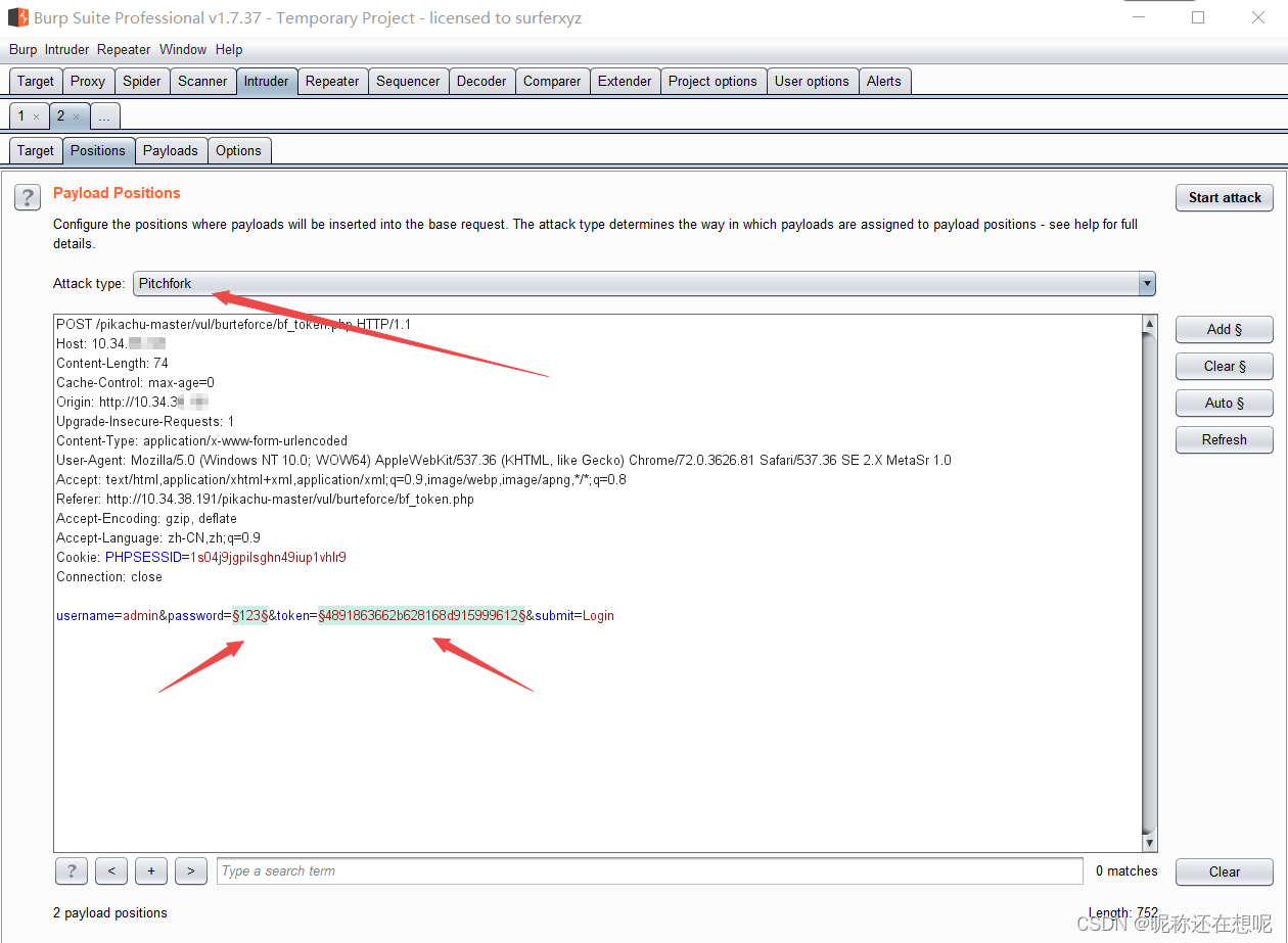 将请求包send to intruder里 选择Pitchfork ( 每个变量对应另一个唯一变量)