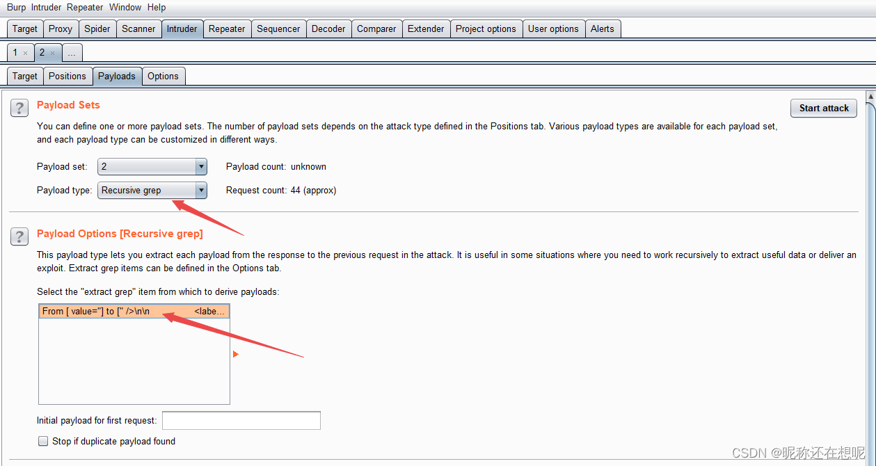 回到payloads设置界面对payload2进行设置 选择recursive grep 选择刚刚生成的规则