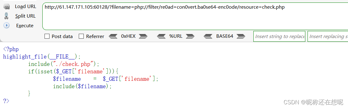php://filter/read=“这段的位置为过滤器”/resource=check.php