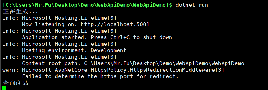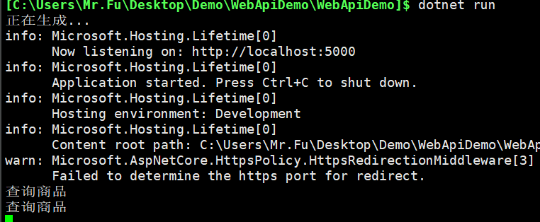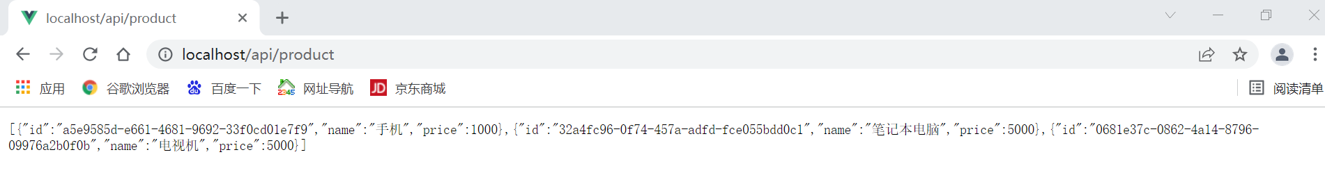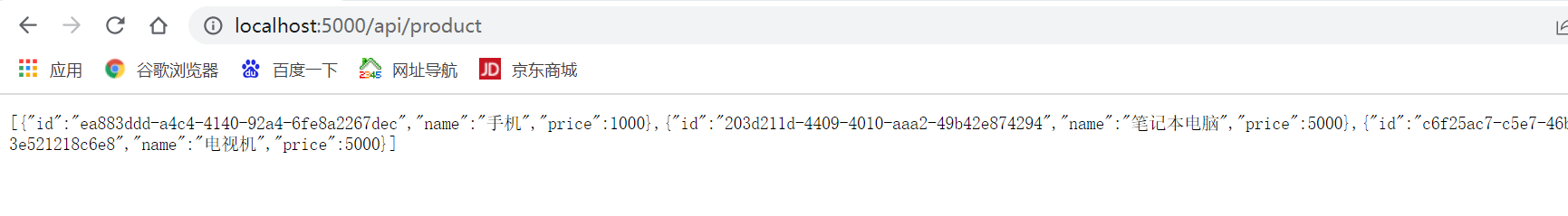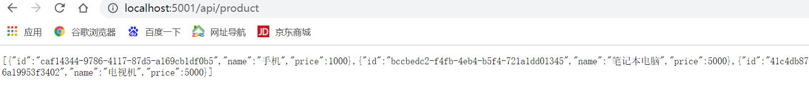 [Route("api/[controller]")] [ApiController] public class ProductController : ControllerBase { /// <summary> ///获取商品数据 /// </summary> /// <returns></returns> [HttpGet] public IActionResult Get() { List<Product> list = new List<Product>() { new Product(){ Name="手机", Price = 1000 }, new Product(){ Name="笔记本电脑", Price = 5000 }, new Product() { Name="电视机", Price = 5000 } }; System.Console.WriteLine("查询商品"); return Ok(list); } } -