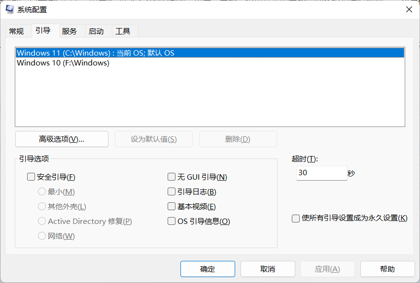 引导——设置默认值这是第一步。第二步 切换系统:我的电脑——属性——高级系统设置——第二个设置——设置默认时间和操作系统。这样子在重启电脑就有30s的时间去切换你想要的系统。