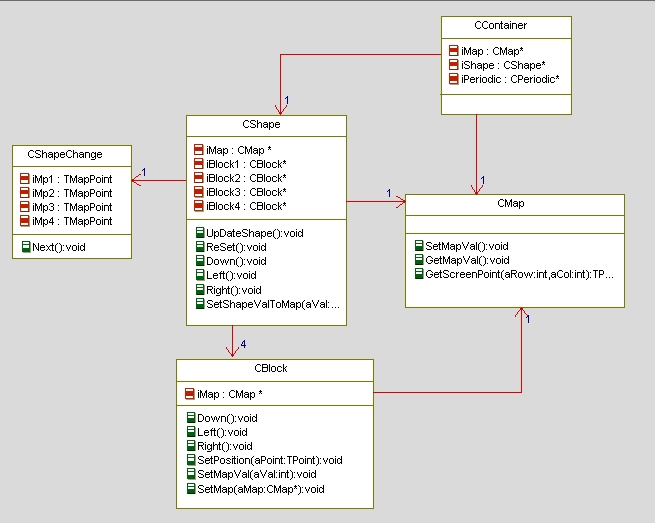 对于变换的图形(CShape),我进行了简单的抽象和功能分离。图形的变化主要是通过组成图形的基本元素(方块)的移动来实现的,每个图形有4个方块组成,方块的的功能由CBlock控制,图形的变换功能由CShapeChange类实现。用这种方法实现,我们在扩展其他图形的时候会很方便。主要类图关系如下(做的很粗糙):