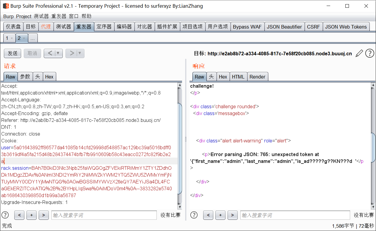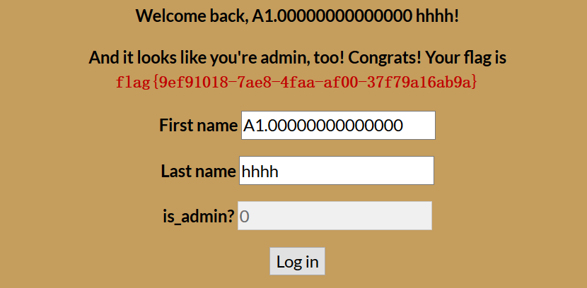 这时cookie实际为:{"first_name":"A1.00000000000000","last_name":"hhhh","is_admin":1.000000000000000},就能够满足题目要求