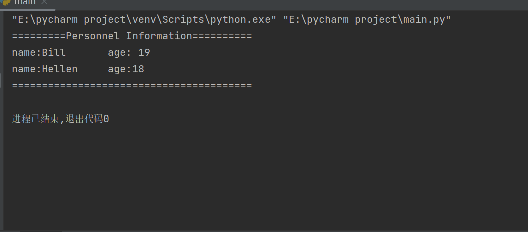 1 name1,age1='Bill',19 2 name2,age2='Hellen',18 3 title='Personnel Information' 4 print(f'{title:=^40}') 5 print(f'name:{name1:10} age:{age1:3}') 6 print(f'name:{name2:10} age:{age2:2}') 7 print(40*'=')