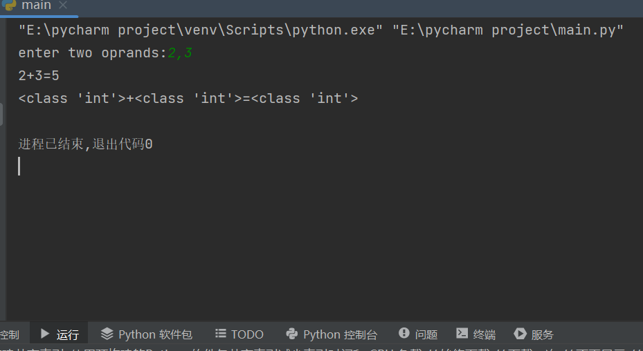 1 x,y=eval(input('enter two oprands:')) 2 ans=x+y 3 4 print(f'{x}+{y}={ans}') 5 print(f'{type(x)}+{type(y)}={type(ans)}')
