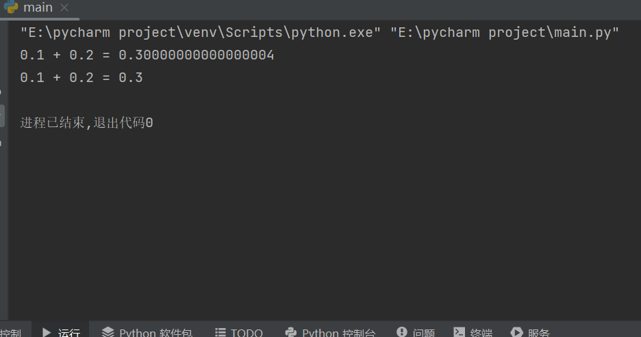 1 ans1 = 0.1 + 0.2 2 print(f'0.1 + 0.2 = {ans1}') 3 4 import decimal 5 6 ans2 = decimal.Decimal('0.1') + decimal.Decimal('0.2') 7 print(f'0.1 + 0.2 = {ans2}')