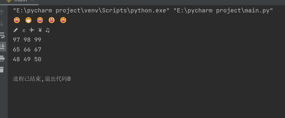 1 print(chr(10000),end=" ") 2 print(chr(0x025b),end=" ") 3 print(chr(0x2708),end=" ") 4 print(chr(0x00A5),end=" ") 5 print(chr(0x266b)) 6 7 print(ord('a'),end=" ") 8 print(ord('b'),end=" ") 9 print(ord('c')) 10 11 print(ord('A'),end=" ") 12 print(ord('B'),end=" ") 13 print(ord('C')) 14 15 print(ord('0'),end=" ") 16 print(ord('1'),end=" ") 17 print(ord('2'))
