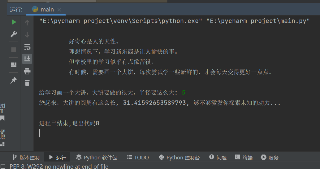 1 import math 2 3 text = ''' 4 好奇心是人的天性。 5 理想情况下,学习新东西是让人愉快的事。 6 但学校里的学习似乎有点像苦役。 7 有时候,需要画一个大饼,每次尝试学一些新鲜的,才会每天变得更好一点点。 8 ''' 9 print(text) 10 11 r = float(input('给学习画一个大饼,大饼要做的很大,半径要这么大: ')) 12 13 circle = 2*math.pi*r 14 15 print(f'绕起来,大饼的圆周有这么长, {circle}, 够不够激发你探索未知的动力...')