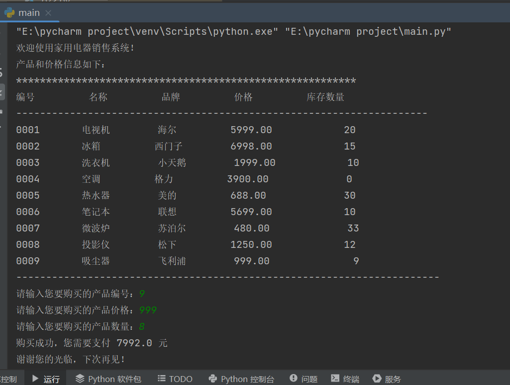 1 """ 2 家用电器销售系统 3 V1.0 4 """ 5 6 #欢迎信息 7 print('欢迎使用家用电器销售系统!') 8 9 #产品信息列表 10 print('产品和价格信息如下:') 11 print('*********************************************************') 12 print('%-10s'%'编号','%-10s'%'名称','%-10s'%'品牌','%-10s'%'价格','%-10s'%'库存数量') 13 print('---------------------------------------------------------------------') 14 print('%-10s'%'0001','%-10s'%'电视机','%-10s'%'海尔','%-10.2f'%5999.00,'%10d'%20) 15 print('%-10s'%'0002','%-10s'%'冰箱','%-10s'%'西门子','%-10.2f'%6998.00,'%10d'%15) 16 print('%-10s'%'0003','%-10s'%'洗衣机','%-10s'%'小天鹅','%-10.2f'%1999.00,'%10d'%10) 17 print('%-10s'%'0004','%-10s'%'空调','%-10s'%'格力','%-10.2f'%3900.00,'%10d'%0) 18 print('%-10s'%'0005','%-10s'%'热水器','%-10s'%'美的','%-10.2f'%688.00,'%10d'%30) 19 print('%-10s'%'0006','%-10s'%'笔记本','%-10s'%'联想','%-10.2f'%5699.00,'%10d'%10) 20 print('%-10s'%'0007','%-10s'%'微波炉','%-10s'%'苏泊尔','%-10.2f'%480.00,'%10d'%33) 21 print('%-10s'%'0008','%-10s'%'投影仪','%-10s'%'松下','%-10.2f'%1250.00,'%10d'%12) 22 print('%-10s'%'0009','%-10s'%'吸尘器','%-10s'%'飞利浦','%-10.2f'%999.00,'%10d'%9) 23 print('-----------------------------------------------------------------------') 24 25 #用户输人信息 26 prodect_id=input('请输入您要购买的产品编号:') 27 price=float(input('请输入您要购买的产品价格:')) 28 count=int(input('请输入您要购买的产品数量:')) 29 30 #计算金额 31 print('购买成功,您需要支付',price * count,'元')
