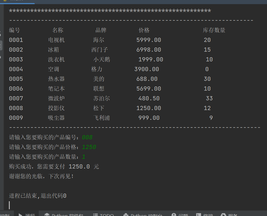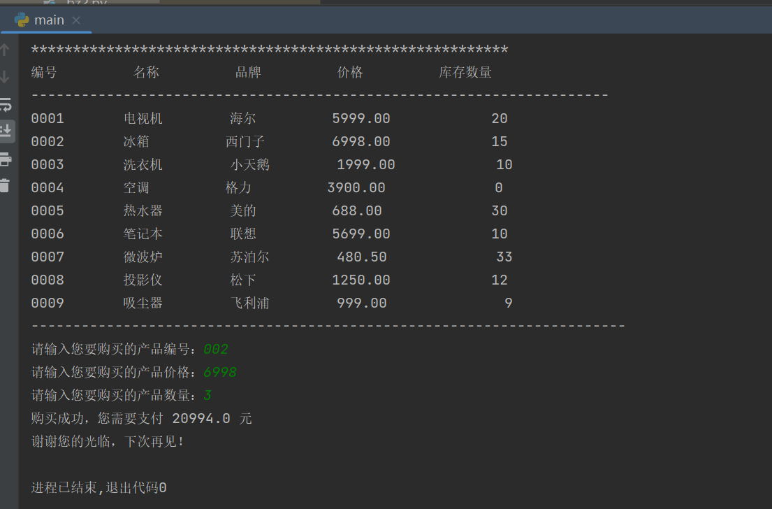 1 """ 2 家用电器销售系统 3 V1.0 4 """ 5 6 #欢迎信息 7 print('欢迎使用家用电器销售系统!') 8 9 #产品信息列表 10 print('产品和价格信息如下:') 11 print('*********************************************************') 12 print('{:<10}'.format('编号'),'{:<10}'.format('名称'),'{:<10}'.format('品牌'),'{:<10}'.format('价格'),'{:<10}'.format('库存数量')) 13 print('---------------------------------------------------------------------') 14 print('{:<10}'.format('0001'),'{:<10}'.format('电视机'),'{:<10}'.format('海尔'),'{:<10.2f}'.format(5999.00),'{:>10}'.format(20)) 15 print('{:<10}'.format('0002'),'{:<10}'.format('冰箱'),'{:<10}'.format('西门子'),'{:<10.2f}'.format(6998.00),'{:>10}'.format(15)) 16 print('{:<10}'.format('0003'),'{:<10}'.format('洗衣机'),'{:<10}'.format('小天鹅'),'{:<10.2f}'.format(1999.00),'{:>10}'.format(10)) 17 print('{:<10}'.format('0004'),'{:<10}'.format('空调'),'{:<10}'.format('格力'),'{:<10.2f}'.format(3900.00),'{:>10}'.format(0)) 18 print('{:<10}'.format('0005'),'{:<10}'.format('热水器'),'{:<10}'.format('美的'),'{:<10.2f}'.format(688.00),'{:>10}'.format(30)) 19 print('{:<10}'.format('0006'),'{:<10}'.format('笔记本'),'{:<10}'.format('联想'),'{:<10.2f}'.format(5699.00),'{:>10}'.format(10)) 20 print('{:<10}'.format('0007'),'{:<10}'.format('微波炉'),'{:<10}'.format('苏泊尔'),'{:<10.2f}'.format(480.50),'{:>10}'.format(33)) 21 print('{:<10}'.format('0008'),'{:<10}'.format('投影仪'),'{:<10}'.format('松下'),'{:<10.2f}'.format(1250.00),'{:>10}'.format(12)) 22 print('{:<10}'.format('0009'),'{:<10}'.format('吸尘器'),'{:<10}'.format('飞利浦'),'{:<10.2f}'.format(999.00),'{:>10}'.format(9)) 23 print('-----------------------------------------------------------------------') 24 25 #用户输人信息 26 prodect_id=input('请输入您要购买的产品编号:') 27 price=float(input('请输入您要购买的产品价格:')) 28 count=int(input('请输入您要购买的产品数量:')) 29 30 #计算金额 31 print('购买成功,您需要支付',price * count,'元') 32 33 #退出系统 34 print("谢谢您的光临,下次再见!")