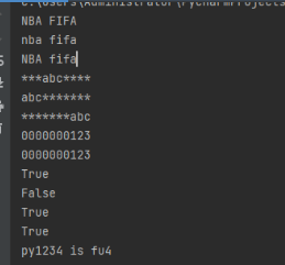 1 x='nba FIFA' 2 print(x.upper()) 3 print(x.lower()) 4 print(x.swapcase()) 5 x='abc' 6 print(x.center(10,'*')) 7 print(x.ljust(10,'*')) 8 print(x.rjust(10,'*')) 9 x='123' 10 print(x.zfill(10)) 11 x=123 12 print(str(x).zfill(10)) 13 x='phone_number' 14 print(x.isidentifier()) 15 x='222test' 16 print(x.isidentifier()) 17 x=' ' 18 print(x.isspace()) 19 x='\n' 20 print(x.isspace()) 21 x='python is fun' 22 table=x.maketrans('thon','1234') 23 print(x.translate(table))