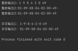 1 x=[1,9,8,4,2,0,49] 2 print('整数输出1:',end='') 3 i=0 4 while i<len(x): 5 print(x[i],end=' ') 6 i+=1 7 print('\n整数输出2:',end='') 8 i=0 9 while i<len(x): 10 print(f'{x[i]:02d}', end = '-') 11 i+=1 12 print('\n整数输出3:',end='') 13 i=0 14 while i<len(x)-1: 15 print(f'{x[i]:02d}', end='-') 16 i+=1 17 print(f'{x[-1]:02d}') 18 print('\n字符输出1: ', end = '') 19 y1 = [] 20 i = 0 21 while i<len(x): 22 y1.append(str(x[i])) 23 i+=1 24 print('-'.join(y1)) 25 print('字符输出2: ', end = '') 26 y2 = [] 27 i = 0 28 while i < len(x): 29 y2.append( str(x[i]).zfill(2) ) 30 i+=1 31 print('-'.join(y2))