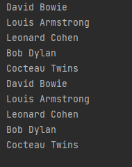 1 name_list = ['david bowie', 'louis armstrong', 'leonard cohen', 'bob dylan', 2 'cocteau twins'] 3 i=0 4 while i<len(name_list): 5 print(name_list[i].title()) 6 i+=1 7 t = [] 8 i = 0 9 while i < len(name_list): 10 t.append(name_list[i].title()) 11 i += 1 12 print('\n'.join(t))