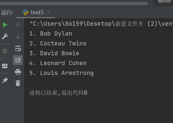1 name_list = ['david bowie', 'louis armstrong', 'leonard cohen', 'bob dylan', 2 'cocteau twins'] 3 i=0 4 s=sorted(name_list) 5 while i<len(s): 6 a=i+1 7 print(f'{a}.',s[i].title()) 8 i+=1