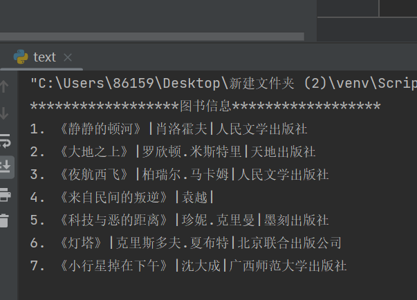 1 book_list = [['静静的顿河','肖洛霍夫','人民文学出版社'], 2 ['大地之上','罗欣顿.米斯特里','天地出版社'], 3 ['夜航西飞', '柏瑞尔.马卡姆','人民文学出版社'], 4 ['来自民间的叛逆', '袁越', '','新星出版社'], 5 ['科技与恶的距离', '珍妮.克里曼', '墨刻出版社'], 6 ['灯塔','克里斯多夫.夏布特','北京联合出版公司'], 7 ['小行星掉在下午','沈大成', '广西师范大学出版社']] 8 print('{:*^40}'.format('图书信息')) 9 i=0 10 while i <len(book_list): 11 print(f'{i+1}.',f'《{book_list[i][0]}》|{book_list[i][1]}|{book_list[i][2]}') 12 i+=1